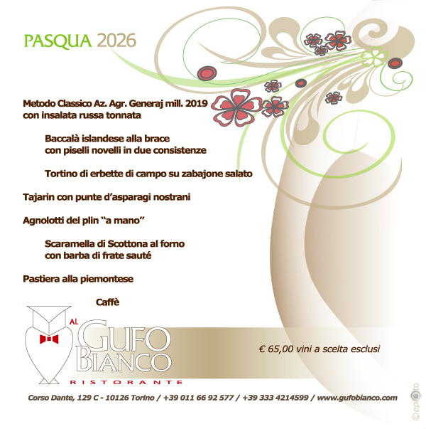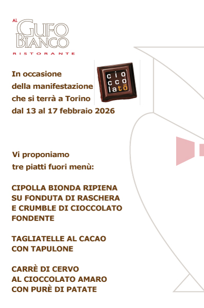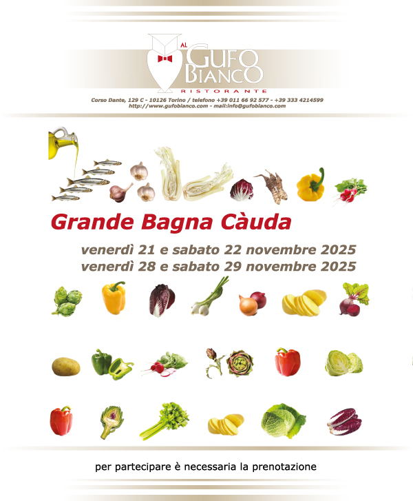 Menù del pranzo di Pasqua 2026Leggi tuttoIn occasione di Cioccolatò 2026Leggi tuttoPranzo di Natale 2025Leggi tuttoBUONISSIMATORINO 2025Leggi tuttoGran Bagna Càuda 2025Leggi tuttoBollito Misto PiemonteseLeggi tuttoMenù della serata flambé 23 maggio 2025Leggi tuttoMenù del pranzo di Pasqua 2025Leggi tuttoMenù del pranzo di Natale 2024Leggi tutto24 ottobre 2024 BUONISSIMA menù a quattro maniLeggi tutto15-16 e 22-23 nov. 2024 Gran Bagna CàudaLeggi tuttoMenù del pranzo di Pasqua 2024Leggi tutto30° ANNIVERSARIOLeggi tuttoMenù del pranzo di Natale 2023Leggi tutto27 ottobre 2023 BUONISSIMA menù a quattro maniLeggi tutto17-18 e 24-25 novembre 2023 Gran Bagna CàudaLeggi tuttoMenù del pranzo di Pasqua 2023Leggi tuttoMenù del pranzo di Natale 2022Leggi tuttoBollito Misto PiemonteseLeggi tutto27 ottobre 2022 BUONISSIMA menù a quattro maniLeggi tuttoven18 – sab19 /11/2022 Gran Bagna CàudaLeggi tuttoAbbiamo inaugurato il nostro nuovo locale 05-06-2022Leggi tuttoMenù del pranzo di Pasqua 2022Leggi tuttoMenù del pranzo di Natale 2021Leggi tutto19-20 e 26-27 novembre 2021 Gran Bagna CàudaLeggi tuttoCarta menù delivery 23-25 aprile 2021Leggi tuttoMenù delivery dal 16 al 18 aprile 2021Leggi tuttoMenù delivery Pasqua 2021Leggi tuttoMenù delivery vegetariano dal 19 al 21 marzo 2021Leggi tuttoMenù delivery quinto quarto dal 19 al 21 marzo 2021Leggi tuttoMenù delivery dal 12 al 14 marzo 2021Leggi tuttoMenù delivery dal 6 al 8 marzo 2021Leggi tuttoSan Valentino 2021Leggi tuttoSan Valentino 2021Leggi tuttoMenù delivery dal 29 al 31 gennaio 2021Leggi tuttoMenù delivery dal 22 al 24 gennaio 2021Leggi tuttoMenù Epifania 2021 DeliveryLeggi tuttoMenù del pranzo di Natale 2020Leggi tutto